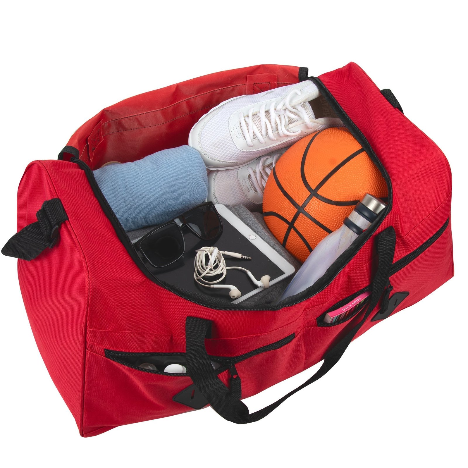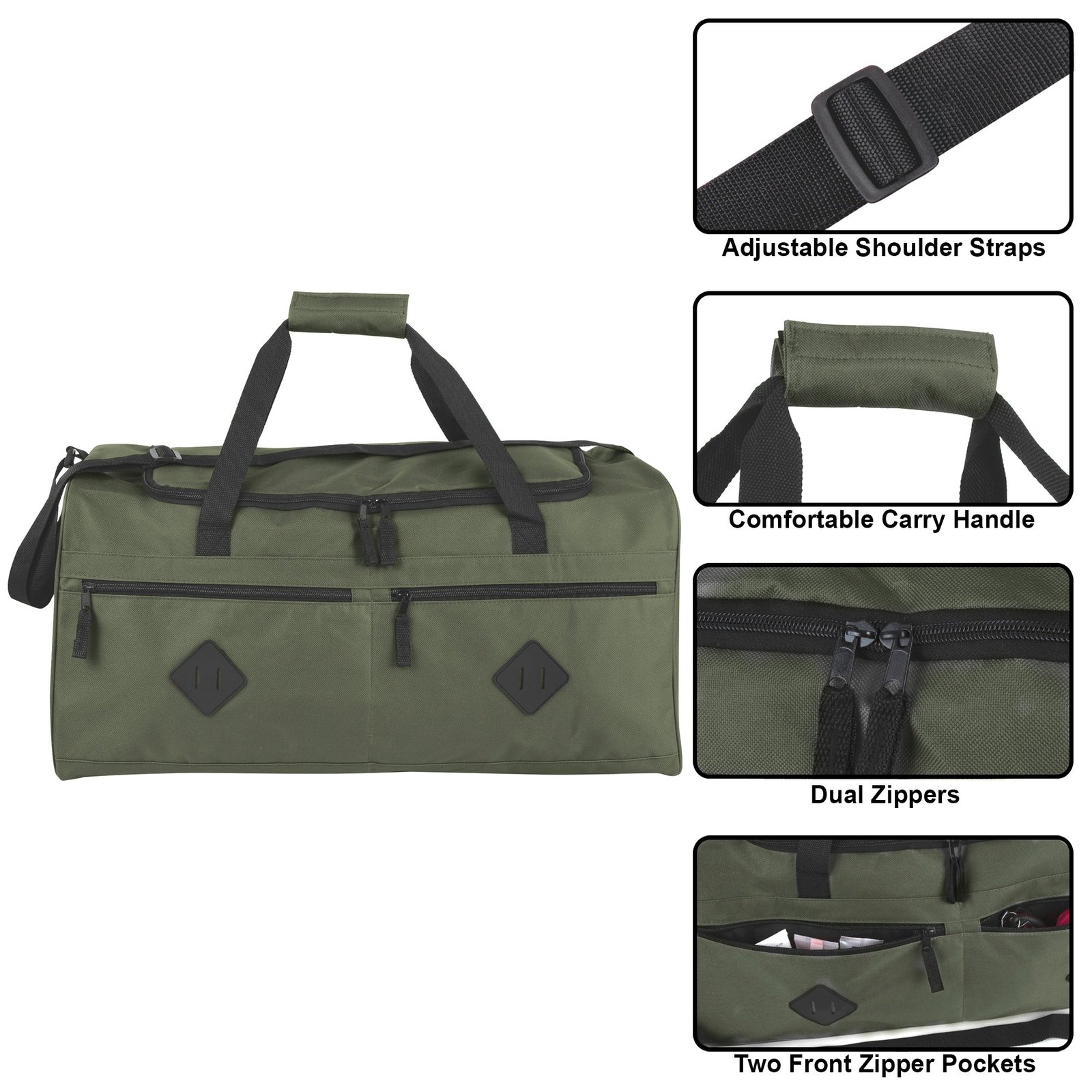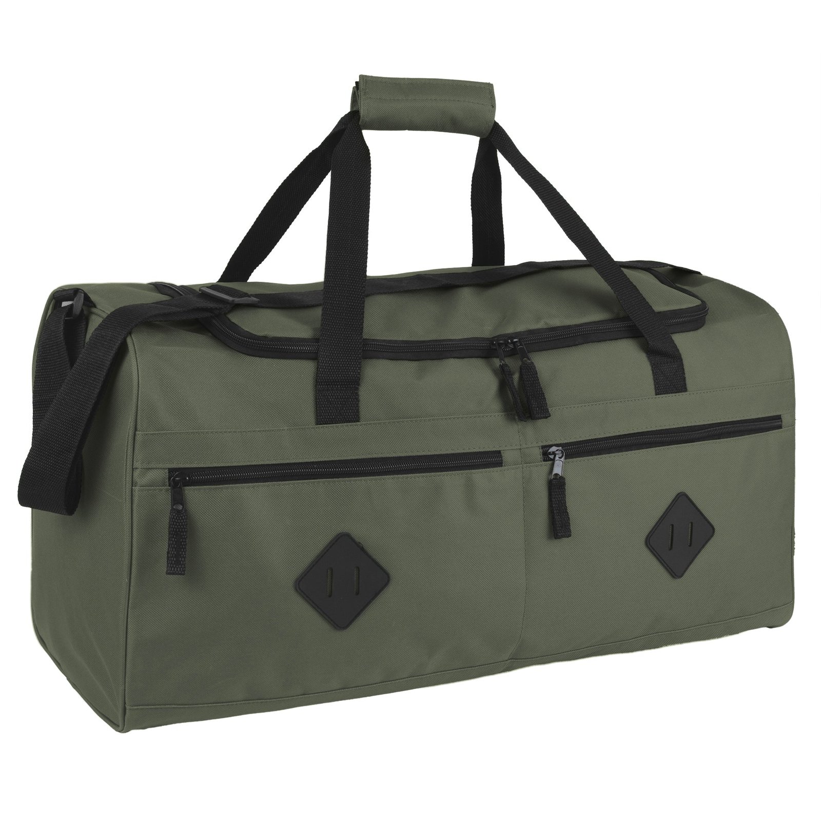 Check out this show stopper! Our Trailmaker deluxe 24 in multi pocket duffle bag is a sleek design. Spacious enough for holding your gym accessories work gear and more. This bag measures 24 x 12 x 11.5. This bag is also made from the highest quality denier polyester. Features on this bag include comfort grip handles, three spacious zippered compartments in all, and easy open two front accessory pockets perfect for storing smaller pieces.