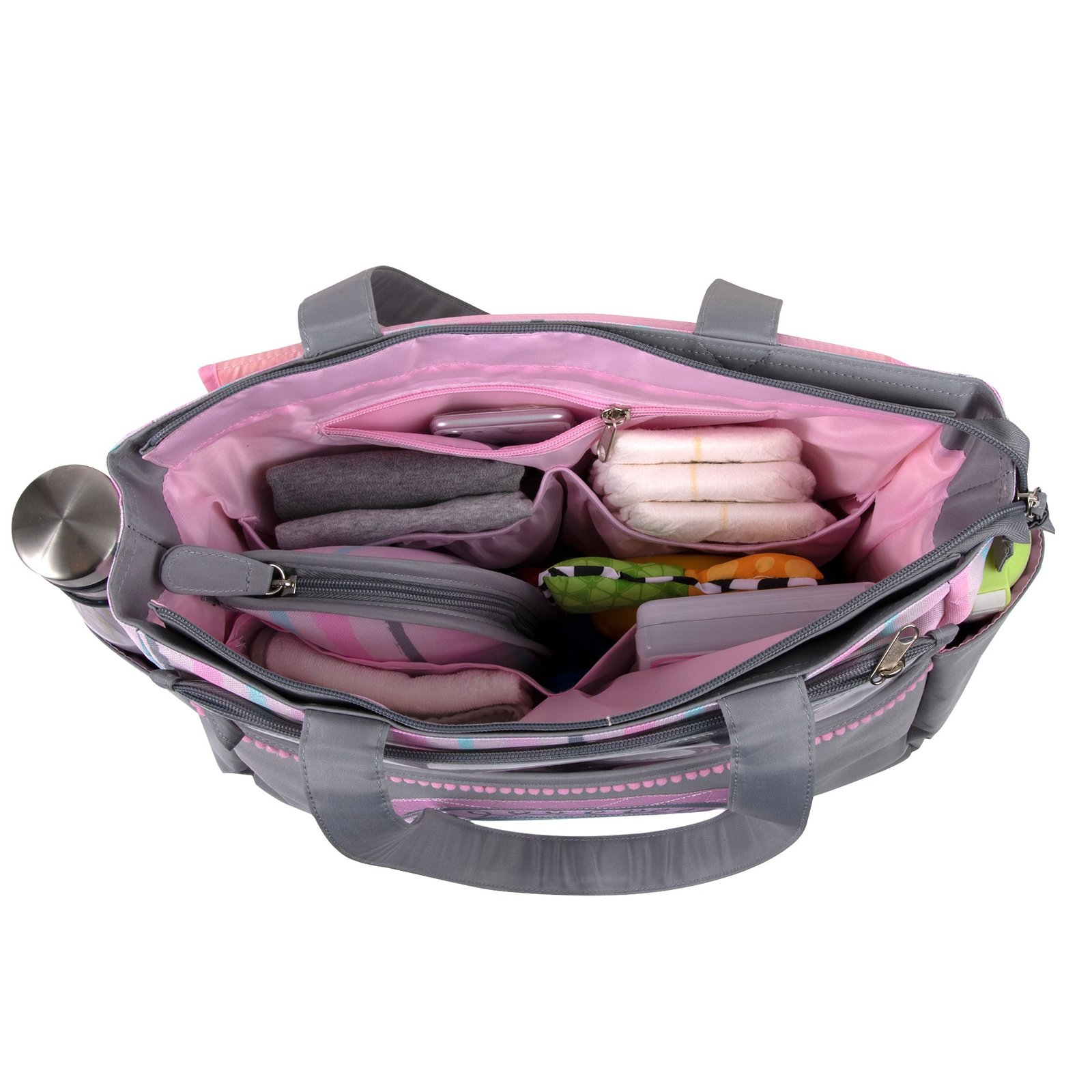 Our Baby Essentials Pink Rainbow Themed Diaper bag is made with love. Cute and stylish, this diaper bag purse has it all. Incredibly roomy, easily fit teething rings, pacifiers, baby shoes, clothes, and more. Features include: 1. Large Diaper bag with several exterior pockets 2. A matching wipes case 3. Matching change mat 4. Large zippered clear pouch 5. An insulated, matching bottle bag that fits up to 2 bottles. This Diaper bag has 4 external slip pockets for easy access to diapers, cellphone, magazine, toys, pacifier, car keys, & more