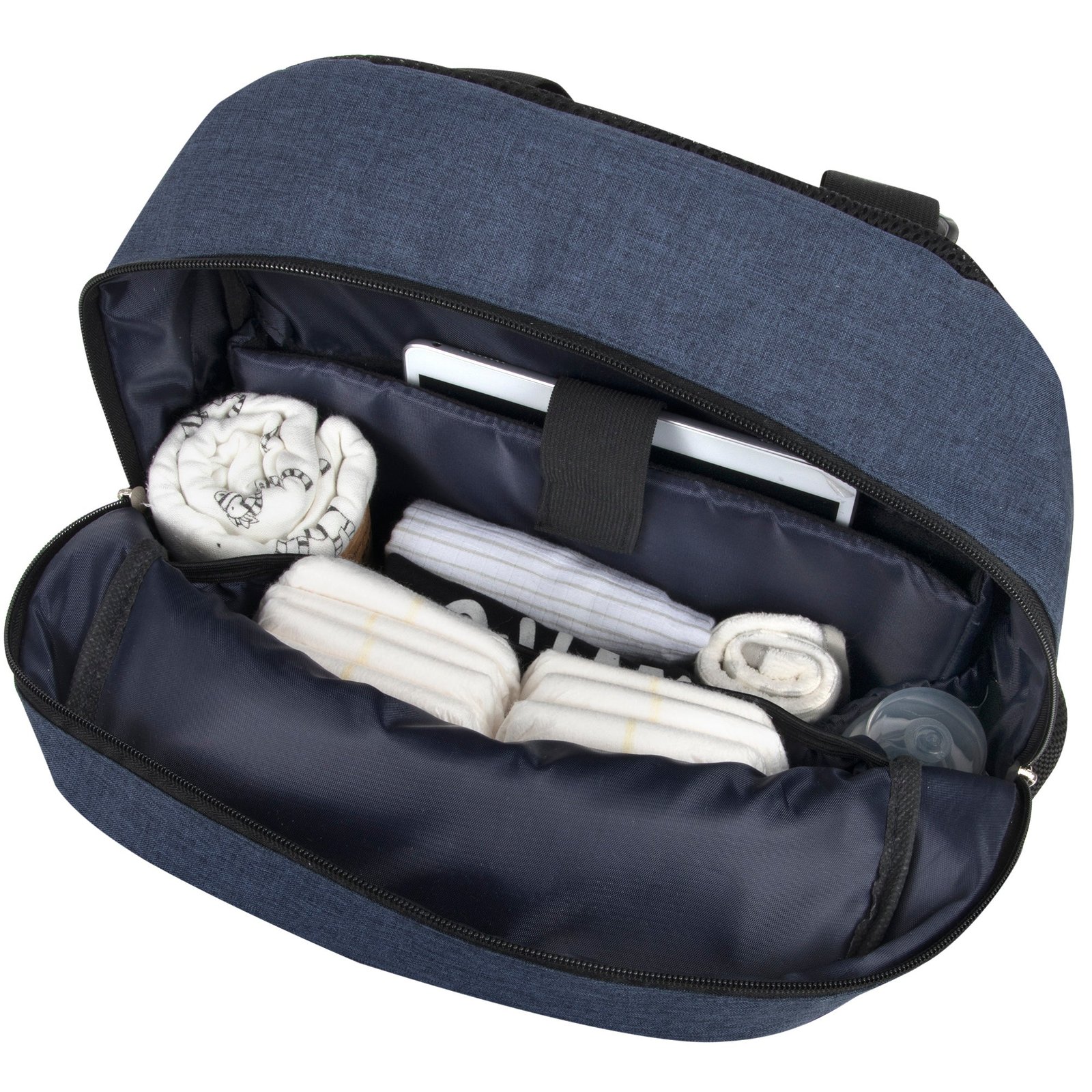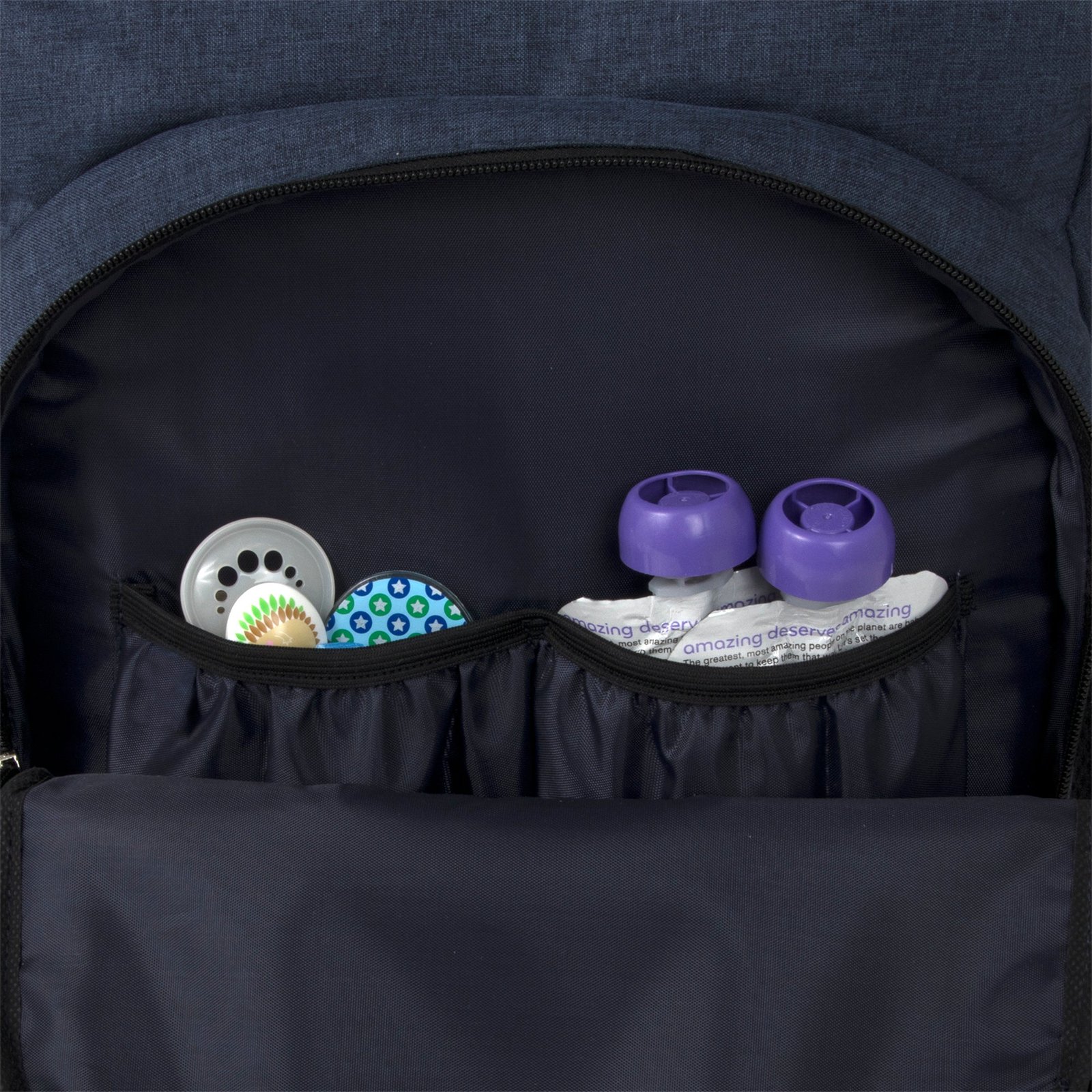 • Internal, Secure, and Zippered Section for Pacifiers, Snacks, and Keys.