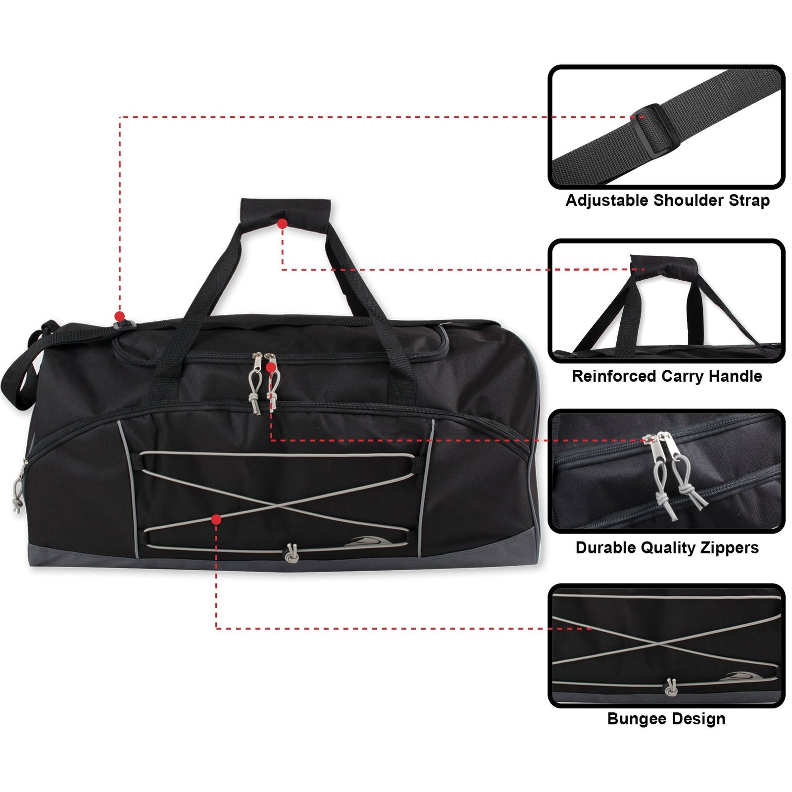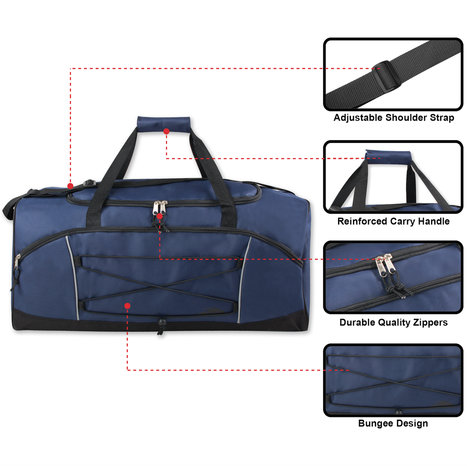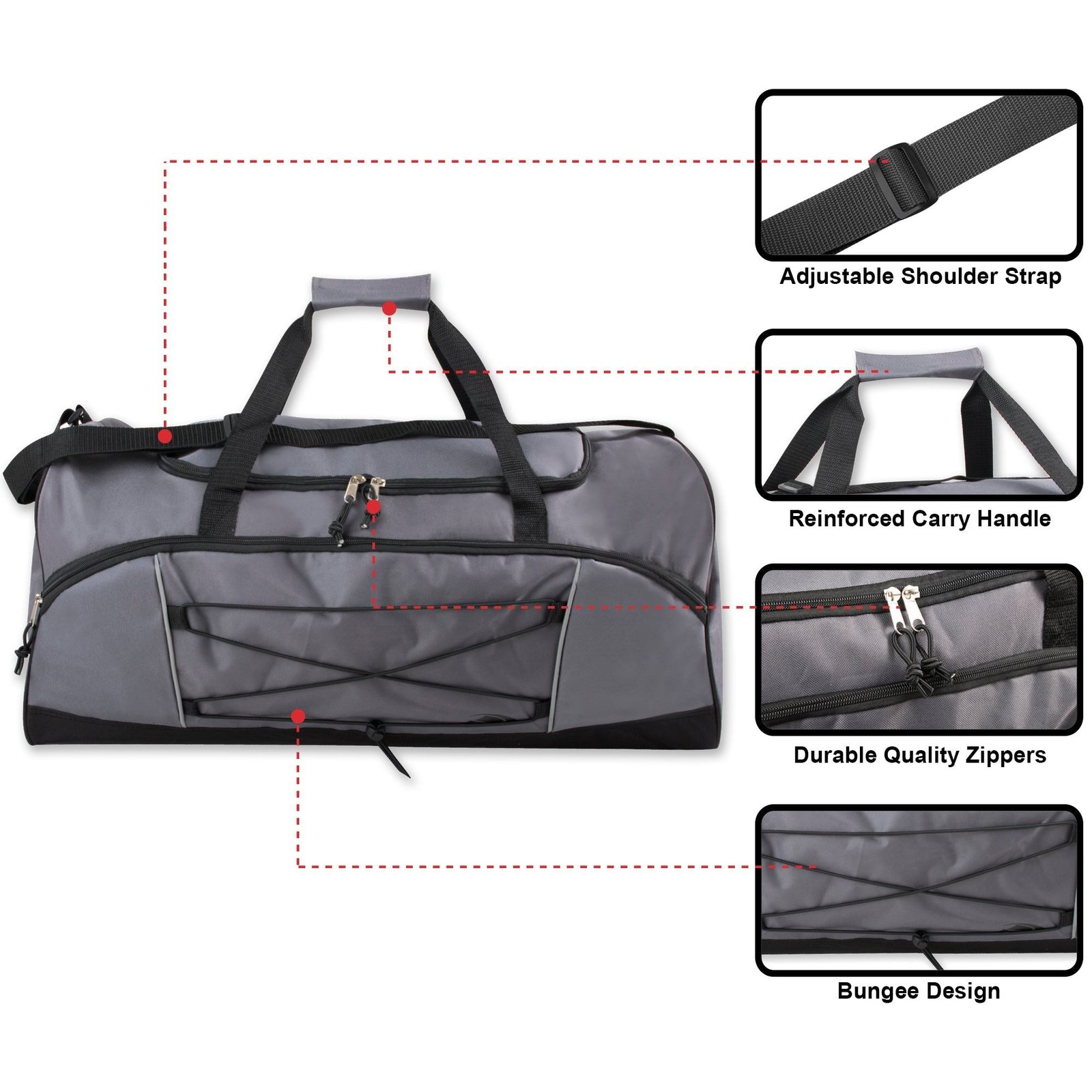 The Trailmaker 26 Inch Bungee Duffel bag has plenty of storage space for travel, sports, or trips to the gym. The Bungee Duffel has a large main compartment with a wide mouth zipper, and a strong bungee cord on the exterior for holding bulky or wet items like coats, towels or swim suits.Made from high quality polyester, with a large front zippered accessory pocket. It also includes a hardened bottom, an adjustable shoulder strap and a shoulder grip. Comes in single and assorted colors.